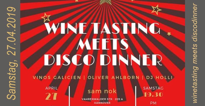 Disco Dinner! Oliver Ahlborn, VINOS galicien, http://www.spanische-weine.online/ sam nok Hannover https://www.facebook.com/sam.nok/ laden euch herzlich ein! Mit dabei ist auch DJ Holli https://www.facebook.com/musikvonholli Karten gibt es nur